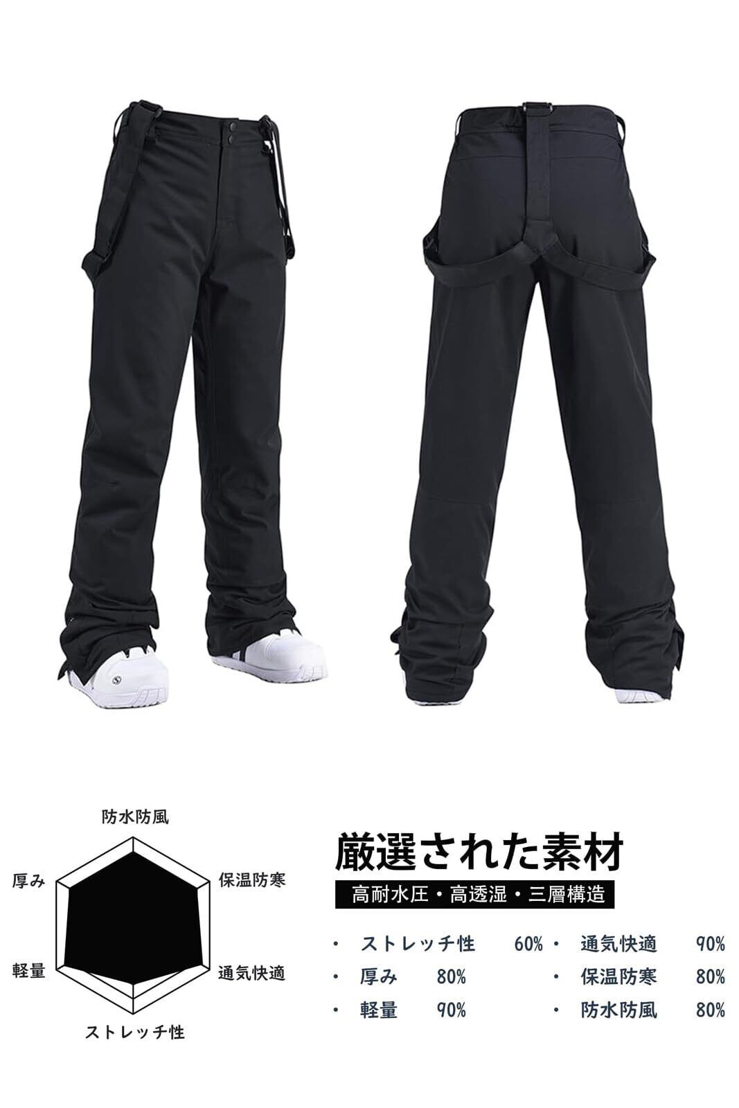 【機能性満載】取り外し可能な調節可能なサスペンダーストラップがパンツを所定の位置に保ちます。ウエストにはマジックテープでウエストの緩さを調節することができます。また、ウエストは隠しボタンとジッパーのダブル構造で安心で、丈夫で長持ち、雪の浸入を防止しやすくなります。脱着にとても便利です。