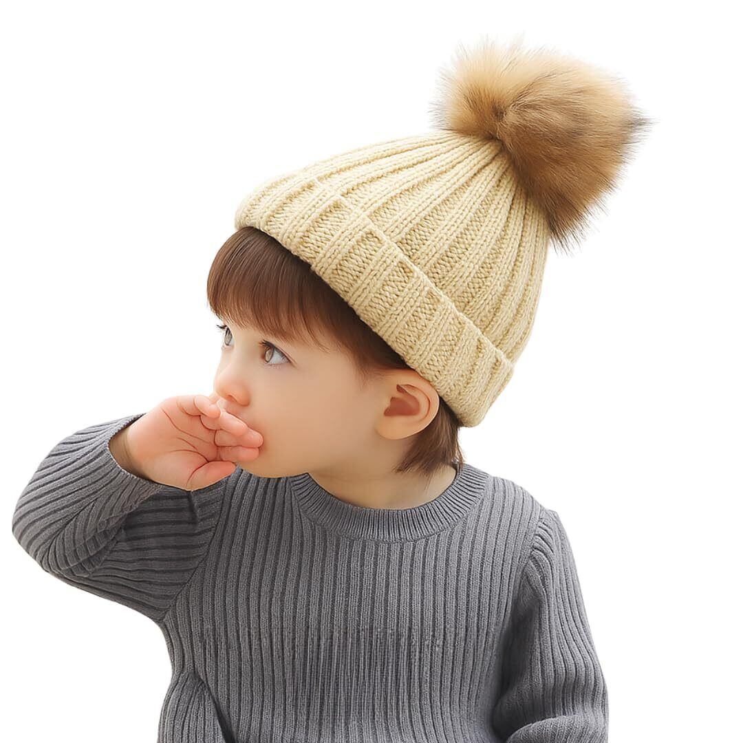 【ふわふわポンポンがアクセント】大きめのフェイクファーポンポン付きで、子どもらしいかわいさとおしゃれ感を演出。男女問わずコーデに合わせやすいデザインです