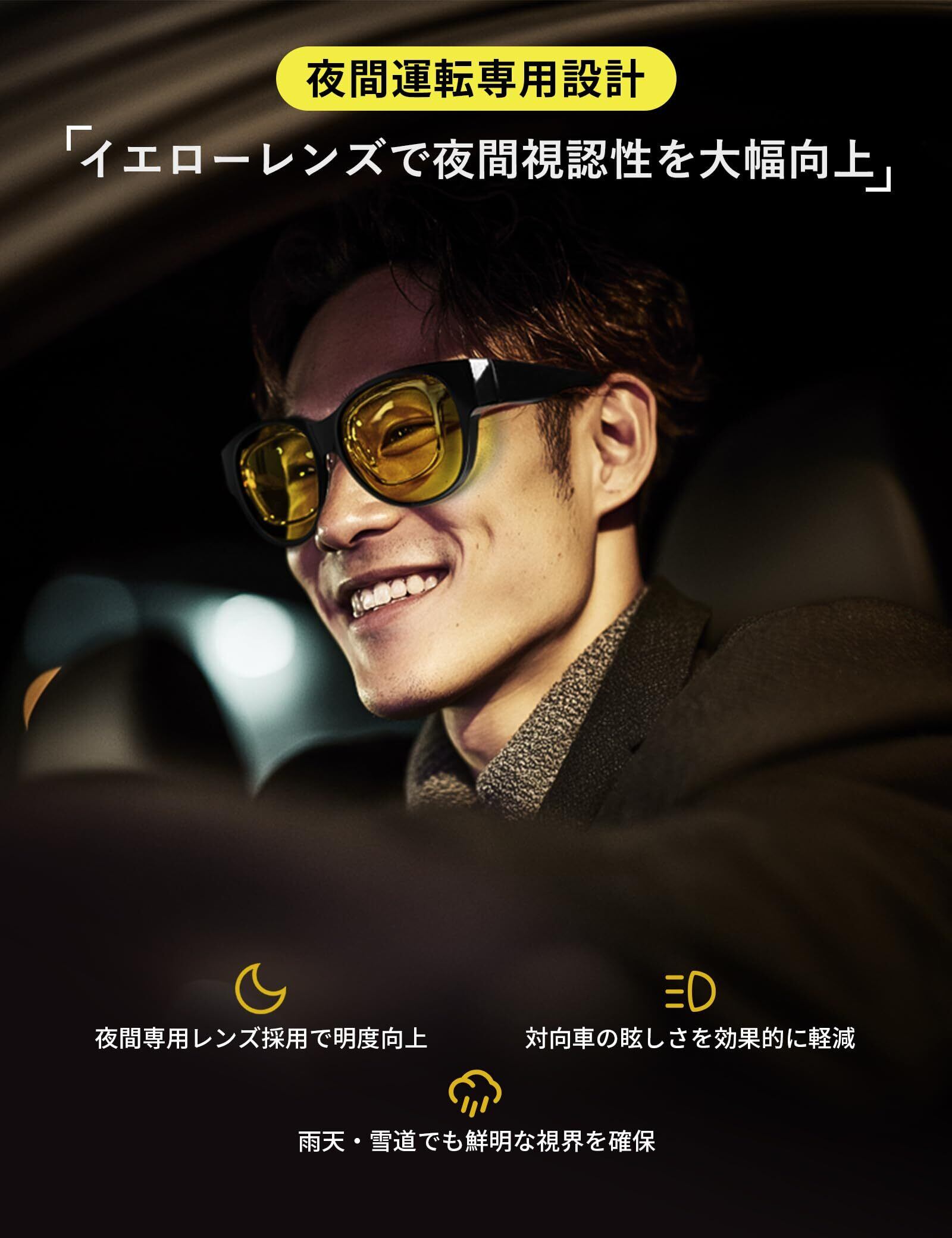 【夜間専用設計】黄色偏光レンズを採用し、夜間の視界を明るくクリアに。光の反射を抑えながら視認性を向上させ、夜間運転・ジョギング・散歩・雨霧天候など視界の悪い場面で安全をサポートします。