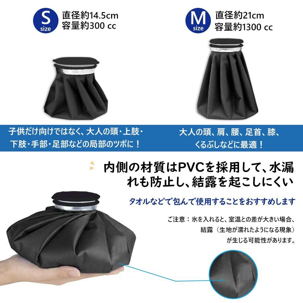 【セット内容物】Sサイズのアイスバッグ(容量約0.3リットル)×1、Mサイズのアイスバッグ(容量約1.3リットル)×1、日本語説明書×1 S:子供に向いているだけでなく、大人の手首、足首などのところにも 適用しています。M:直容量が1.4L、首筋、すね、膝、腰などのところに適用しています。氷を入れると、室温との差が大きい場合、結露(生地が濡れたようになる現象)が生じる可能性があります。タオルなどで包んで使用することをおすすめします。