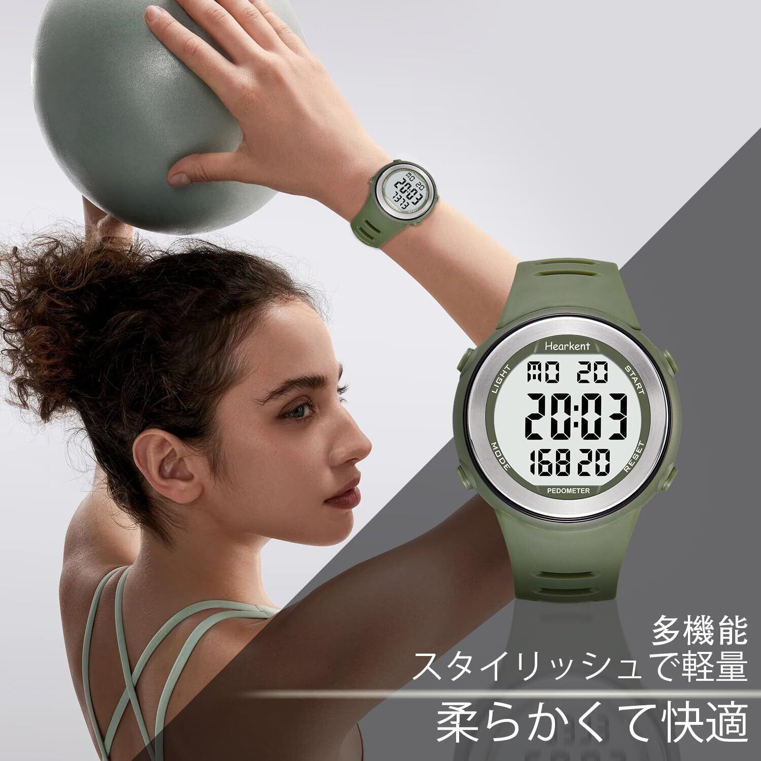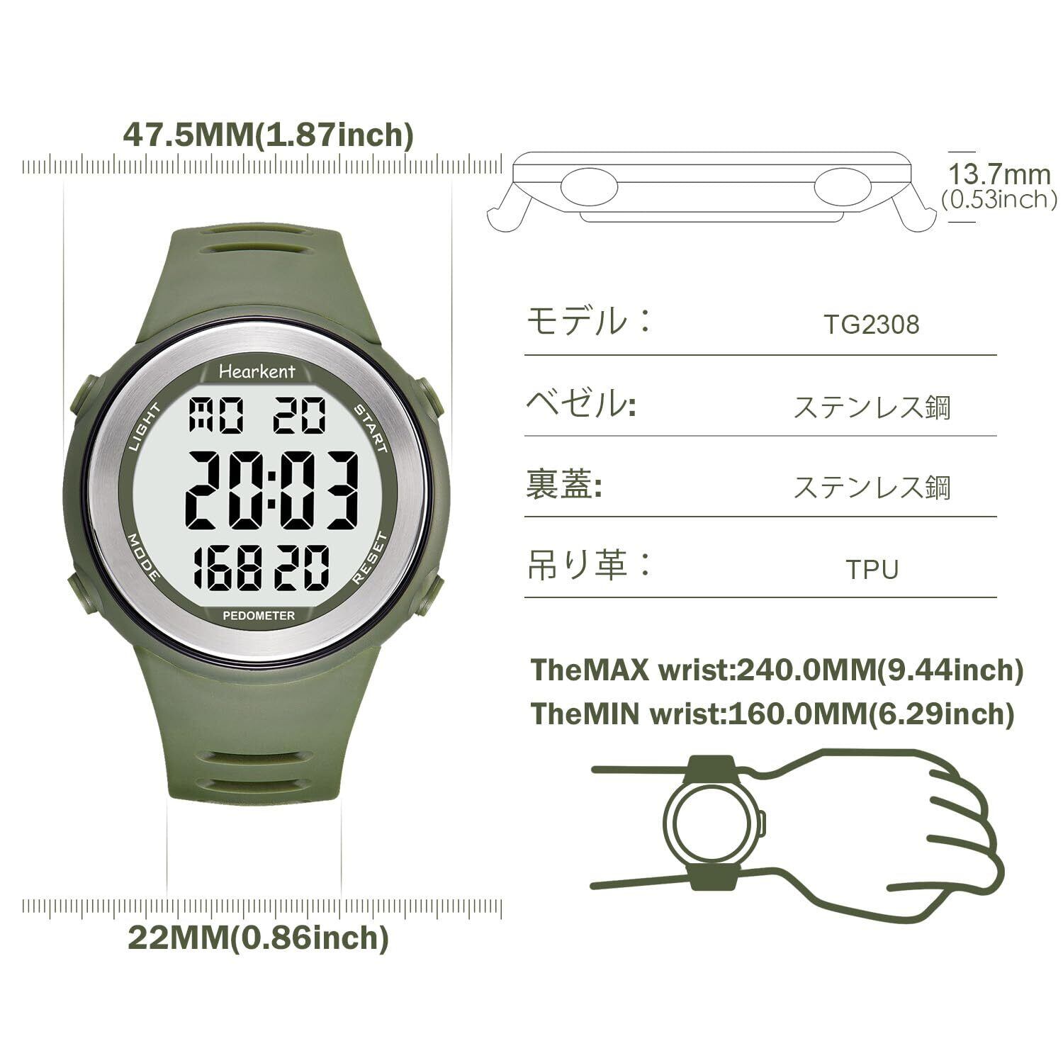 Hearkent 防水歩数計ウォッチ メンズ/ティーンズ向け Bluetoothアプリ不要 ステップカウンター、カロリー、大型LCD数字付きスポーツウォッチ (グリーン)