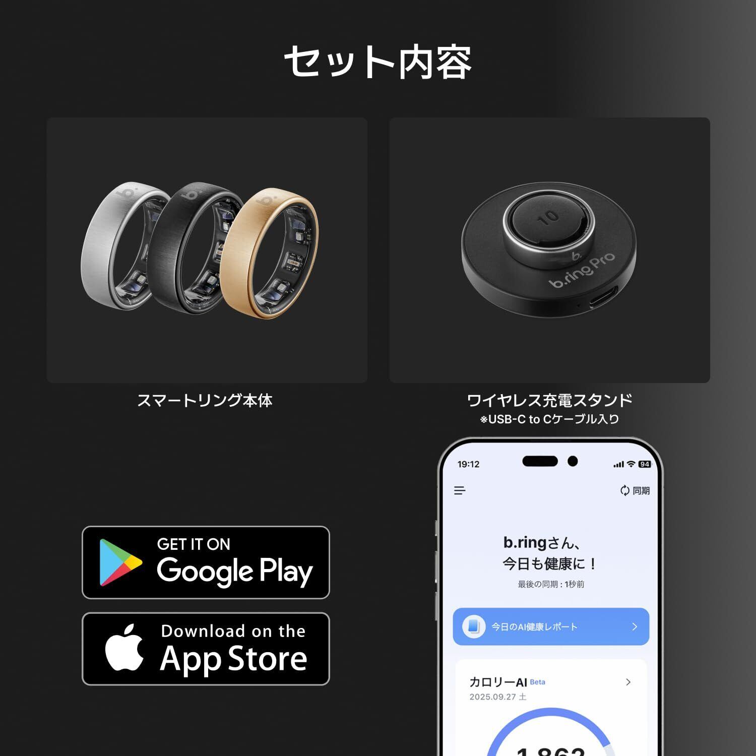 b.ring Pro スマートリング 健康管理 睡眠管理 チタン AI分析 Android iPhone対応 専用アプリ 最大7日間持続 IP68 5ATM 防水 歩数計 超軽量 ワイヤレス充電スタンド付き/ブラック US12号(日本基準26〜28号/内周67.5mm)