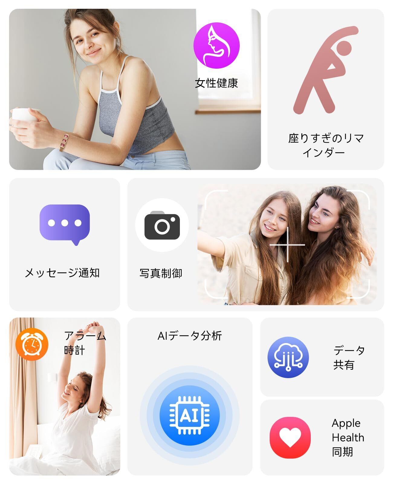 【多彩な実用機能】このフィットネストラッカーは、着信・メッセージ通知、座りすぎアラート、アラーム、おやすみモード、デバイス検索、カメラ操作など多彩なスマート機能を搭載。さらにApple Healthとの連携により、より包括的な健康管理をサポートします。