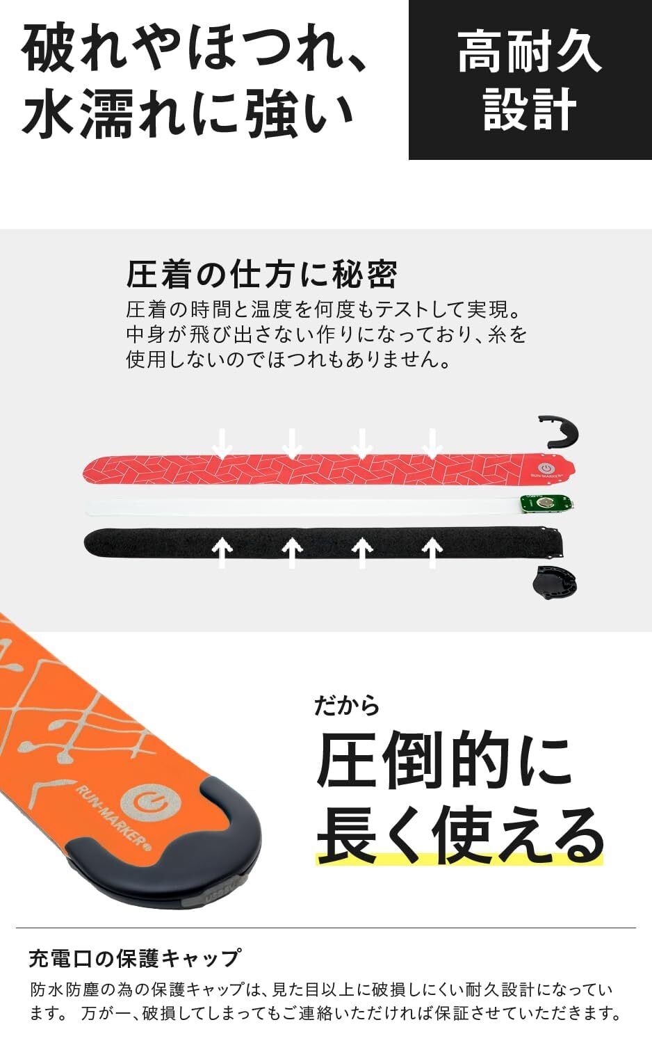 【軽くて薄いのに高耐久】重量がたった36g、厚さたった4mmのランマーカーは、装着感がとても小さく長時間付けていても気になりません。また、他のランニングライトとは異なり、表面生地に水をはじくナイロンを、裏地には衣服や皮膚が擦れて傷つかないように、起毛タイプのマイクロファイバー生地を採用しております。さらに、を取得している特殊な圧着製法で生産しているため、ホツレや破れが発生しにくい耐久性の高いランニングライトに仕上がっております。