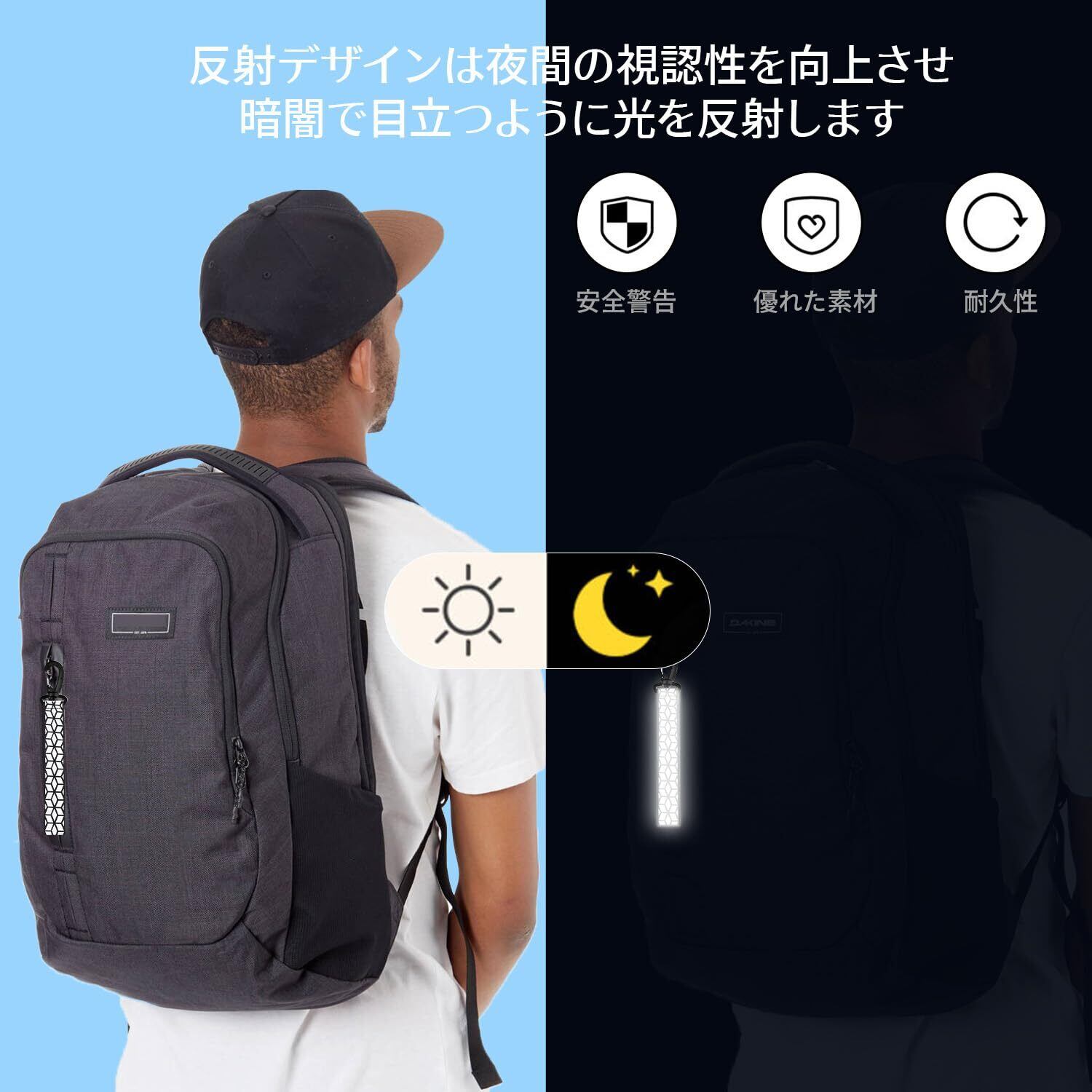 【暗闇でも安心】高反射素材を使用し、夜間や夕暮れ時の視認性を確保。ランニング、サイクリング、キャンプなど、あらゆるアウトドア活動で安全をサポート。