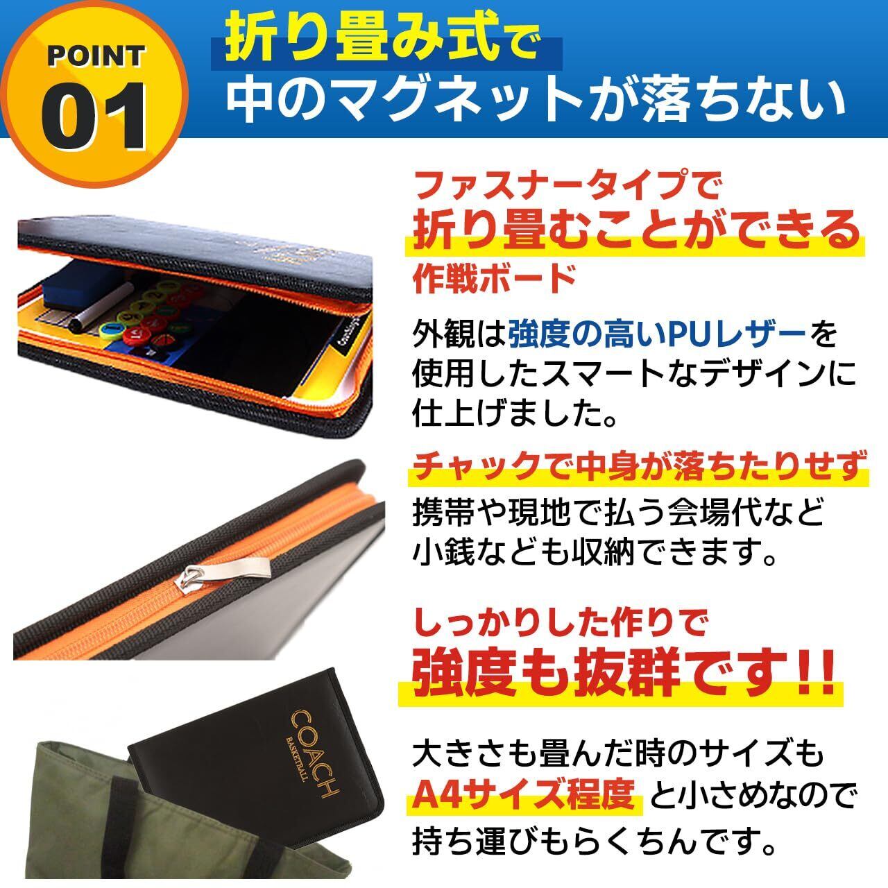 ポイント1【折り畳み式で中のマグネットが落ちない】 ファスナータイプで折り畳むことができる 作戦ボード。外観は強度の高いPUレザーを使用したスマートなデザインに仕上げました。 チャック で中身が落ちたりせず、 携帯や現地で払う会場代など小銭なども収納できます。 しっかりした作りで強度も抜群です!! 大きさも畳んだ時のサイズもA4サイズ程度と小さめなので持ち運びもらくちんです。