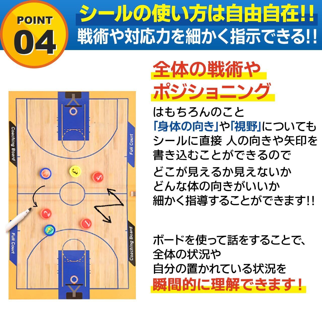 ポイント4【シールの使い方は自由自在!!戦術や対応力を細かく指示できる!!】 バスケット 全体の 戦術 や ポジショニング はもちろんのこと「身体の向き」や「視野」についても、 シールに直接人の向きや矢印を書き込むことができるので、 どこが見えるか見えないかどんな体の向きがいいか細かく指導することができます!! ボード を使って話をすることで、全体の状況や自分の置かれている状況を瞬間的に理解できます!