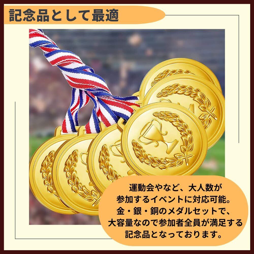 【記念品として最適】運動会やなど、大人数が参加するイベントに対応可能。金・銀・銅のメダルセットで、大容量なので参加者全員が満足する記念品となっております。【小さなお子さまにもおすすめ】幼稚園や低学年の児童にも最適な軽量メダル。 丈夫で安全な素材なので、子どもたちのイベントで大活躍します。【オリジナルメダル】 裏面に好きなものをペンで描いたり、シールを貼ったりするだけで、世界に一つだけのオリジナルメダルが完成します。 お子様の記念品としても喜ばれます。【細部にまでこだわった造り】リーフの彫刻やメッキ加工など、細部まで丁寧に仕上げたメダルは、本物そっくりのクオリティ。【安心の返品・返金】万が一商品にご満足いただけない場合、商品到着から30日間返品・返金対応させて頂きます。また、お困りごとがございましたら、メールサポートにて24時間日本人専任スタッフが対応致しますので、ご安心してお買い求めください。