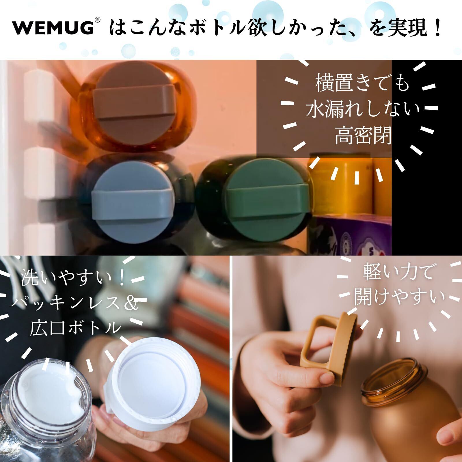 WEMUGの特徴はスタイリッシュなデザインと高い機能性。1. 横置きしてもひっくり返しても水漏れしない高い密閉性(シリコン不使用だから洗いやすい!)。2. 持ち歩くものだから軽いものを選ぼう!超軽量、なのに丈夫なBPAフリーのプラスチック素材を使用。3. 広口で飲みやすい、洗いやすい構造。
