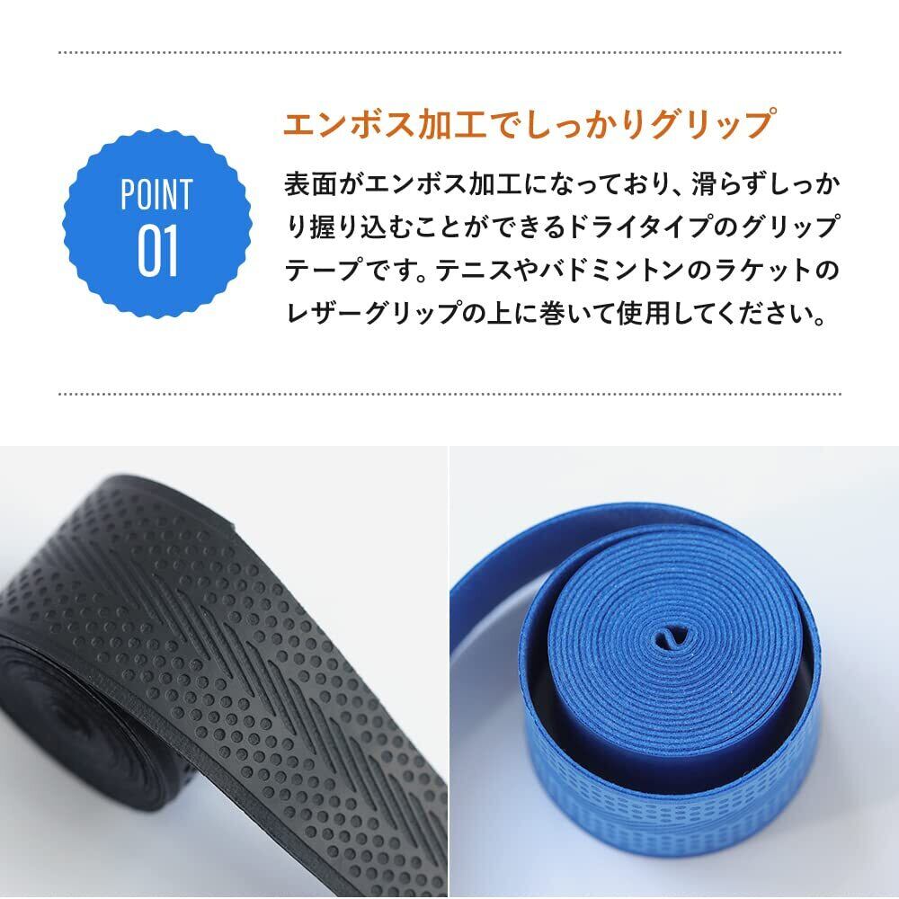 【エンボス加工でしっかりグリップ】 表面がエンボス加工になっており、滑らずしっかり握り込むことができるドライタイプのグリップテープです。テニスやバドミントンのラケットのレザーグリップの上に巻いて使用してください。弾力のある柔らかな手触りでありながらしっかりとした摩擦力があり、よりプレーに集中できます。
