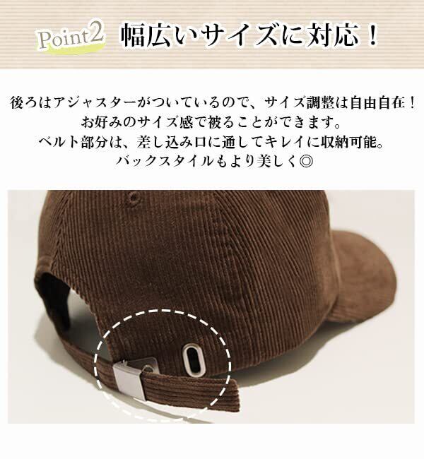 当店オリジナル。人気商品のシンプルキャップのコーデュロイ生地タイプです深めのデザインなので小顔効果もバッチリ頭のサイズに合わせて、後ろのアジャスターでサイズ調整もOK。頭囲57~62センチまでの方におすすめの大きめの作りで男女問わずお使い頂けます。