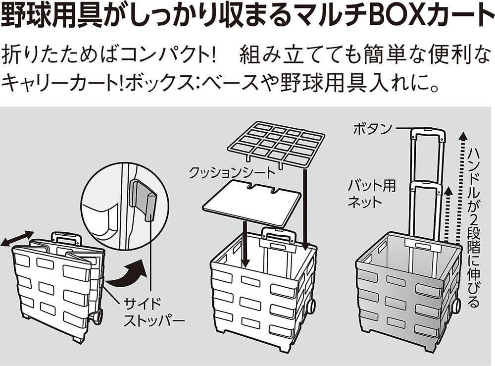 特徴:付属のEVAマットをボックスの内側底にセットして衝撃を吸収しボール入、用具入としても使用できます。付属のネットをボックスの上部にセットするとバットスタンドとしても使用できます。