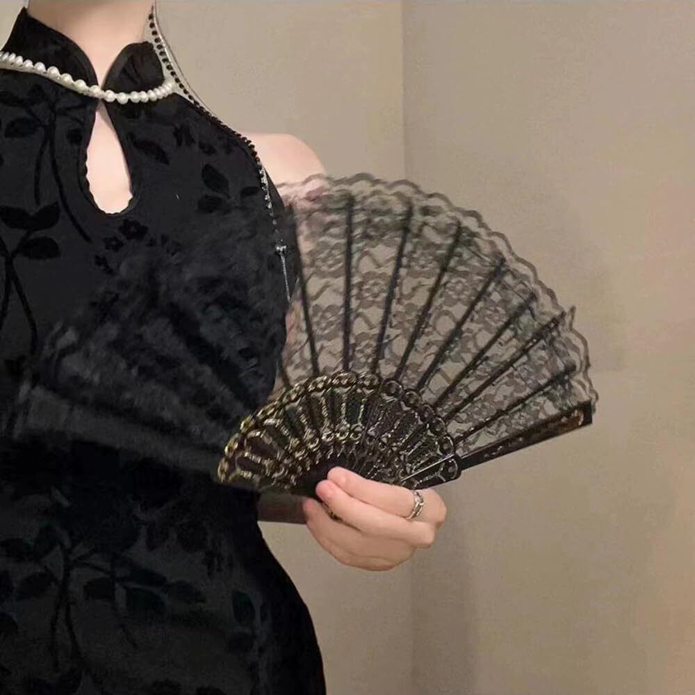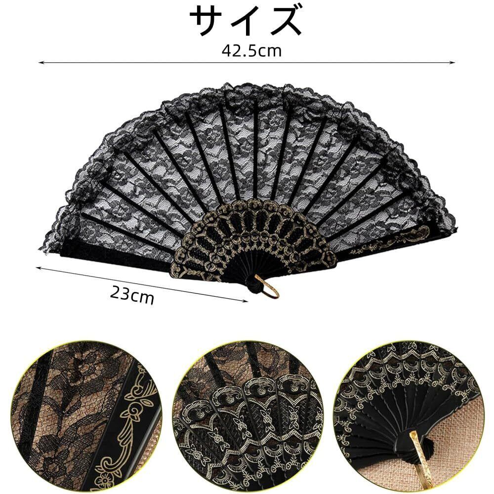 【製品仕様】セット内容:レース扇子2個、カラー:ブラック+レッド、折りたたみ時の長さ約23cm、展開時最大幅約42.5cm。金色の吊り下げリング付きで、簡単に吊り下げられます。