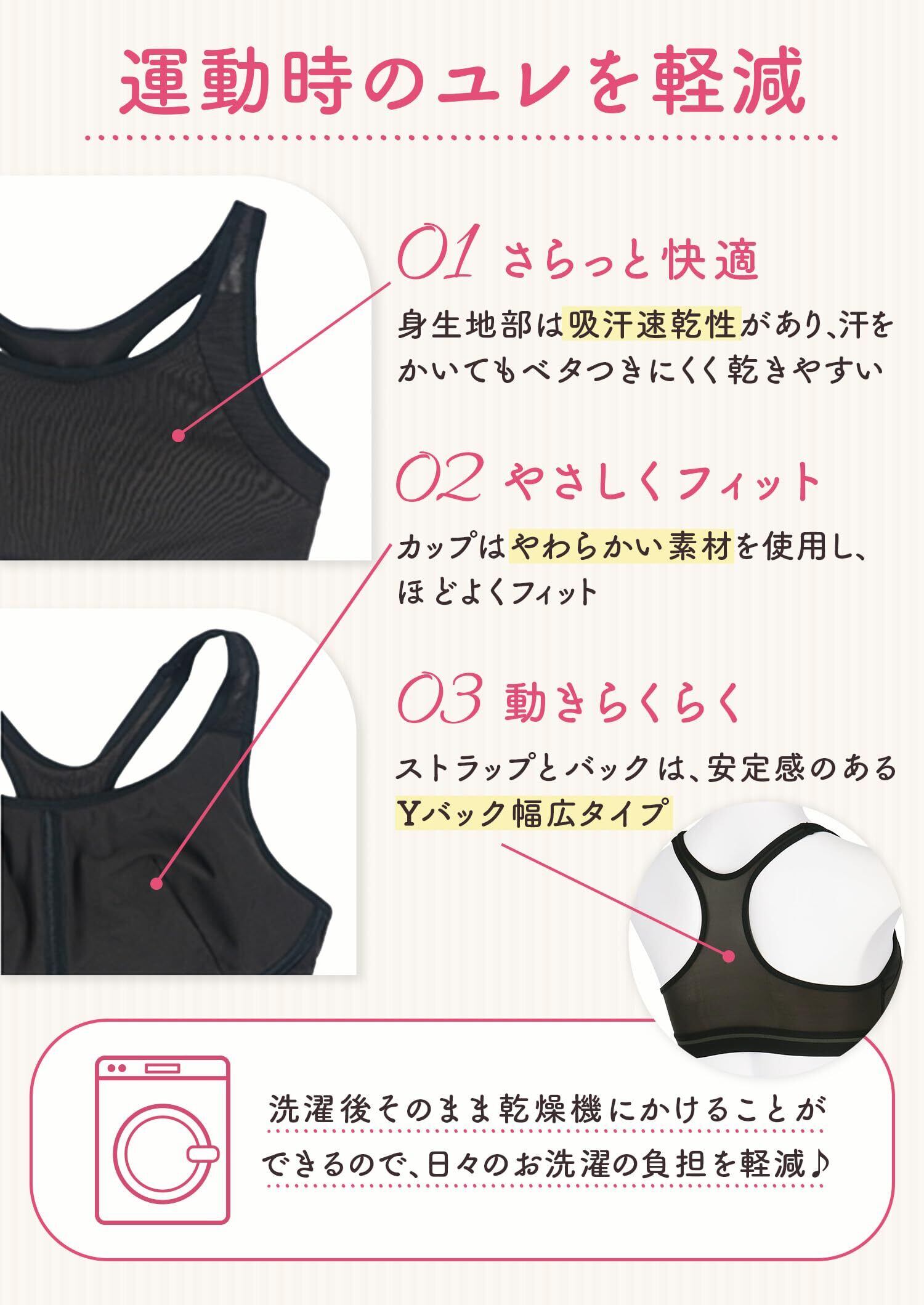 バストのユレや、ストラップのズレ落ちを気にせず、思いっきりからだを動かしてほしい。そんな思いをこめて、まるくボリュームのでてきたティーンの胸をやさしく包んで、様々な動きに対応するスポーツブラをつくりました。パワーネットを内蔵したカップと、幅広のYバックストラップでバストをきちんとサポート。汗をかいてもベタつきにくく乾きやすい吸汗速乾素材を身生地部に使い、快適なつけごこちに。学校生活や休日に使いやすいシンプルなデザイン。